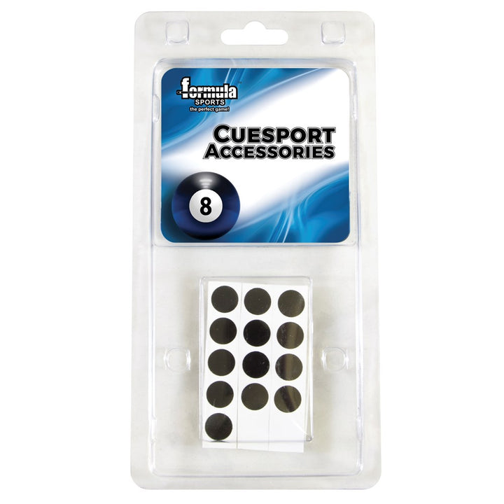 They are self-adhesive and suitable for all pool table cloths. The spots measure 12mm in diameter and come in a pack of 25. Simply peel them from the backing paper and press into position